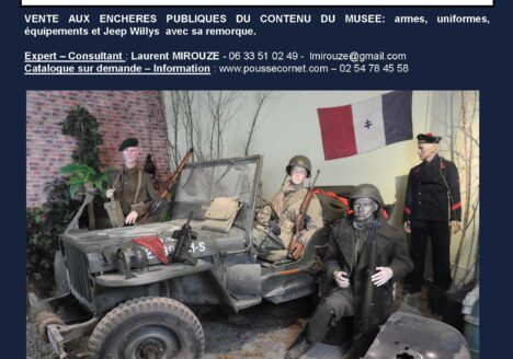 VENTE AUX ENCHERES PUBLIQUES DU CONTENU DU MUSEE: armes, uniformes, équipements et Jeep Willys avec sa remorque. Cliquez sur la photo ci-dessus pour voir l’intégralité.