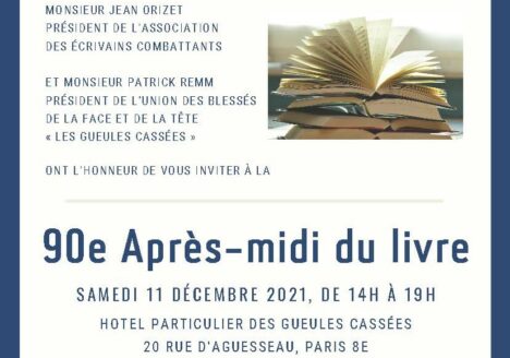 Vous trouverez ci-joint l’invitation à notre prochain salon du livre, qui aura lieu le 11 décembre 2021 à 14 heures en l’hôtel particulier des Gueules Cassées – Union des Blessés de la…